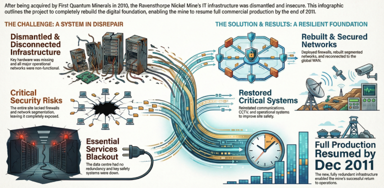 When First Quantum Minerals acquired the mothballed Ravensthorpe Nickel Mine in 2010, IT infrastructure was severely dismantled after the previous operator’s abrupt exit. This included all key hardware missing, networks segmented/non-functional, and no security controls. I built and led the multidisciplinary rebuild team, rapidly assembling engineers, vendors, and contractors to tackle the crisis. I directed the complete end-to-end recovery, restoring core systems, reconstructing segmented networks (GM, Process Control, Fleet, Mining), deploying firewalls and security controls, reinstating IP telephony, CCTV, WLAN, and fuel systems, and eliminating all single points of failure in the data centre.